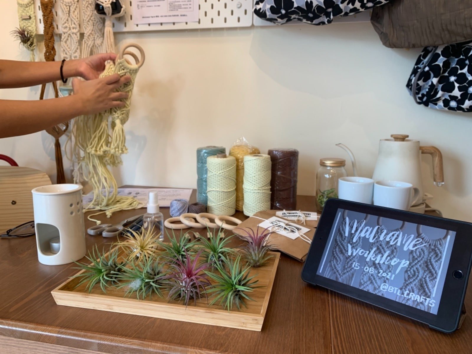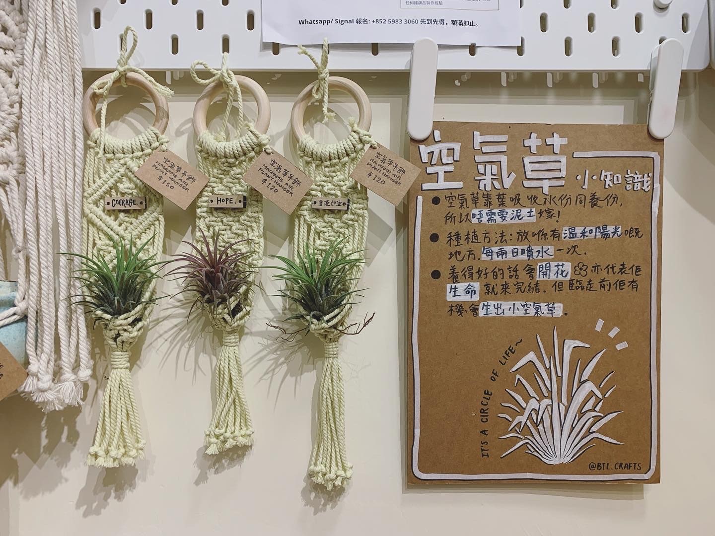 係今次嘅課程,你可以係2小時的時間中放慢步伐、拋開雜念,透過學習基本手工編織繩結技巧,製作空氣草吊飾,體驗手作的樂趣!更可以將空氣草放在製成的吊飾,令房間更添清新綠意!